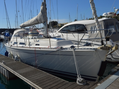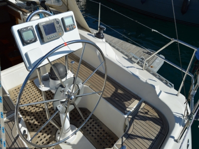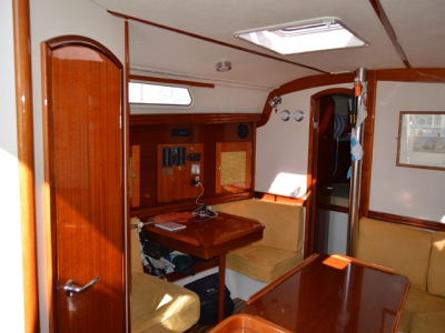 Bow cabin with double bed and cabinet. Spacious salon with U-shaped sofa and table at starboard and 2 single sofas and chart table at port side. Complete equipped L-shaped galley at starboard with electric fridge, double stainless sink, stove and oven. Complete bathroom at port side. Aft 2 cabins both with double bed and cabinet. Good cockpit with steering wheel when a lot of electronic equipment. Equipment: GPS/Plotter, Autopilot, Depthsounder, Wind Station, VHF with DSC, Radio with CD ans MP3 Player, Cockpit Teak, Rigid boomjack, Electric Windlass, Solar Panels with Charger, Dinghy, Outboard Engine 2.3Hp, Hot water system (2013), Heating, Battery Charger, 2 Gel batteries (2014), Inverter. Sails: Main sail with cars in the mast, Full lazy bag with Lazy Jacks, Furling genoa with self-tacking system, Spi pole, Adjustable Backstay, 4 HARKEN winches, Sprayhood (2014), Spinnaker. Boat in good condition.