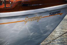 A C Wingate of Offington Park, Surrey commissioned Jack Laurent Giles to design a cruiser racer in 1938 to be built by Sussex Yacht Works Ltd. Shoreham, West Sussex. GREETINGS was launched that year and stationed on the South Coast. After the War E M Shipman of Bristol bought the yacht keeping her in Falmouth. In the early 1950s joint owners P F Carter-Ruck and Captain E N Griffiths of Bishops Stortford acquired GREETINGS and changed her name to FAIR JUDGEMENT 11. After ten years of successful racing they sold her to Richard Aykroyd of Skelton Manor, York who continued to keep FAIR JUDGEMENT 11 on a Hamble mooring. A D Westmore of Hadley Wood, Barnet bought the yacht in 1975 staying on the Hamble. After a succession of new owners the vessel was re-named GREETINGS and refitted in Spain in 1999 when a new interior was fitted. In the current ownership she was sailed from Barcelona to Faro in 2013 and had a second refit in 2013/14. Work included some re-planking, rudder overhaul, electrics, grey water tank and in 2016 rigging and more electrics updated and installed.