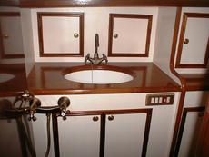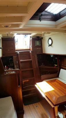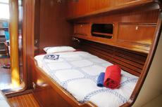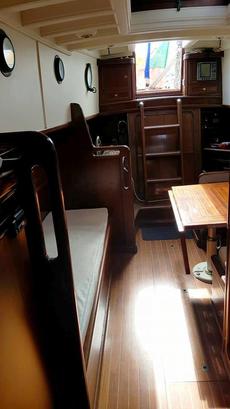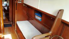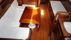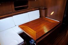 Accommodation for seven in three cabins with over 6ft headroom, traditional interior refitted in 1999. White leather upholstered saloon settee/berths. Folding saloon table.