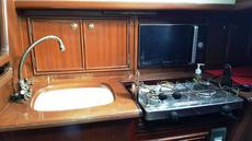 Galley with two burner gas cooker, microwave, sink unit, pantry & crockery lockers, fridge (new 2016)
